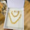 Gold-plated jewelry should be worn with care to maintain its shine and avoid tarnishing. Keep it dry—remove before showering, swimming, or exercising. Apply perfumes, lotions, and sprays before putting it on. Store in a soft pouch or jewelry box, separately from other pieces to prevent scratches. Clean gently with a soft, damp cloth and avoid harsh chemicals.